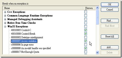 [Debug]->[Exceptions ...] -> 選擇 Win32 Exceptions: c0000005 Access violation